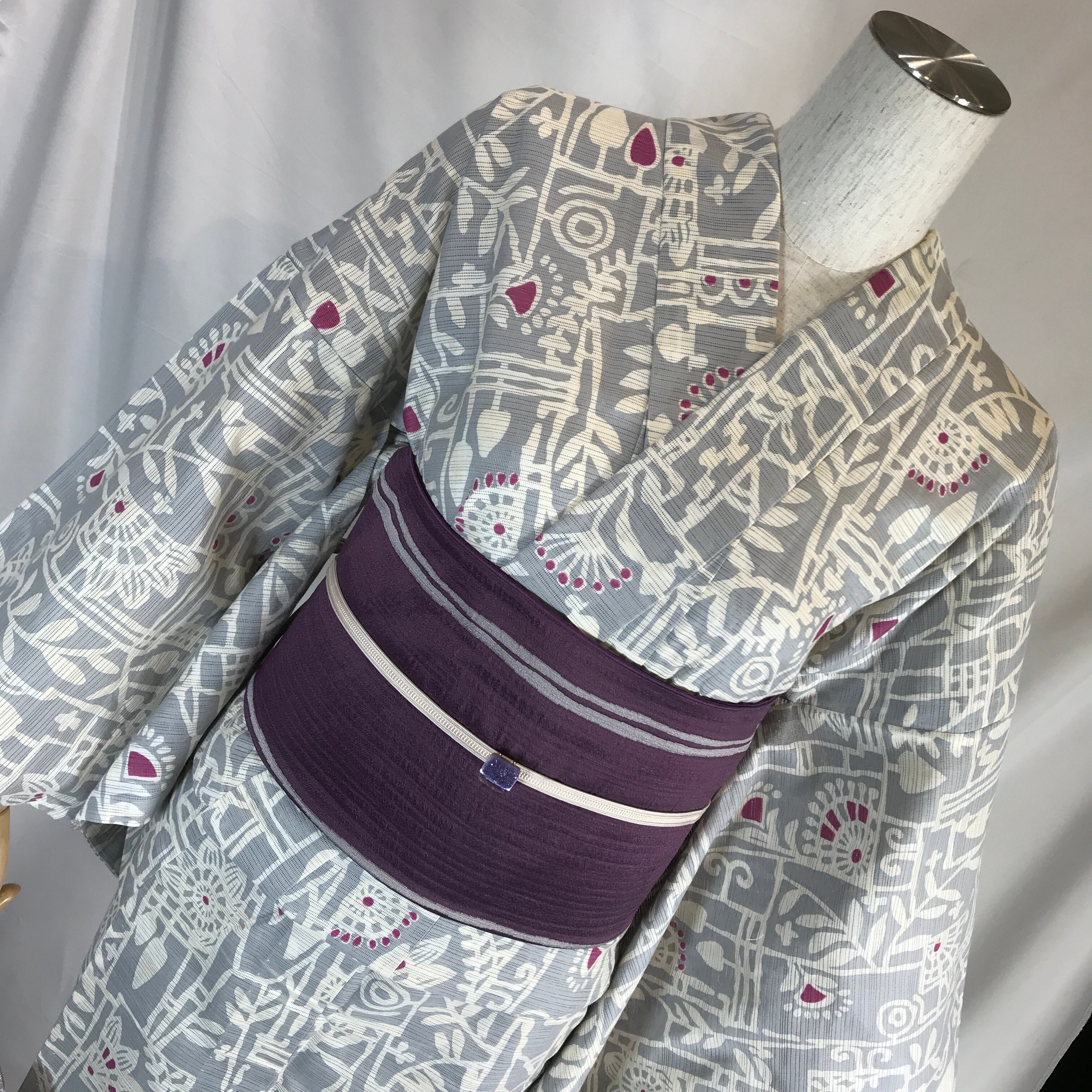 グレー時地に白の象形文字のような不思議な線画が描かれた綿絽の浴衣。