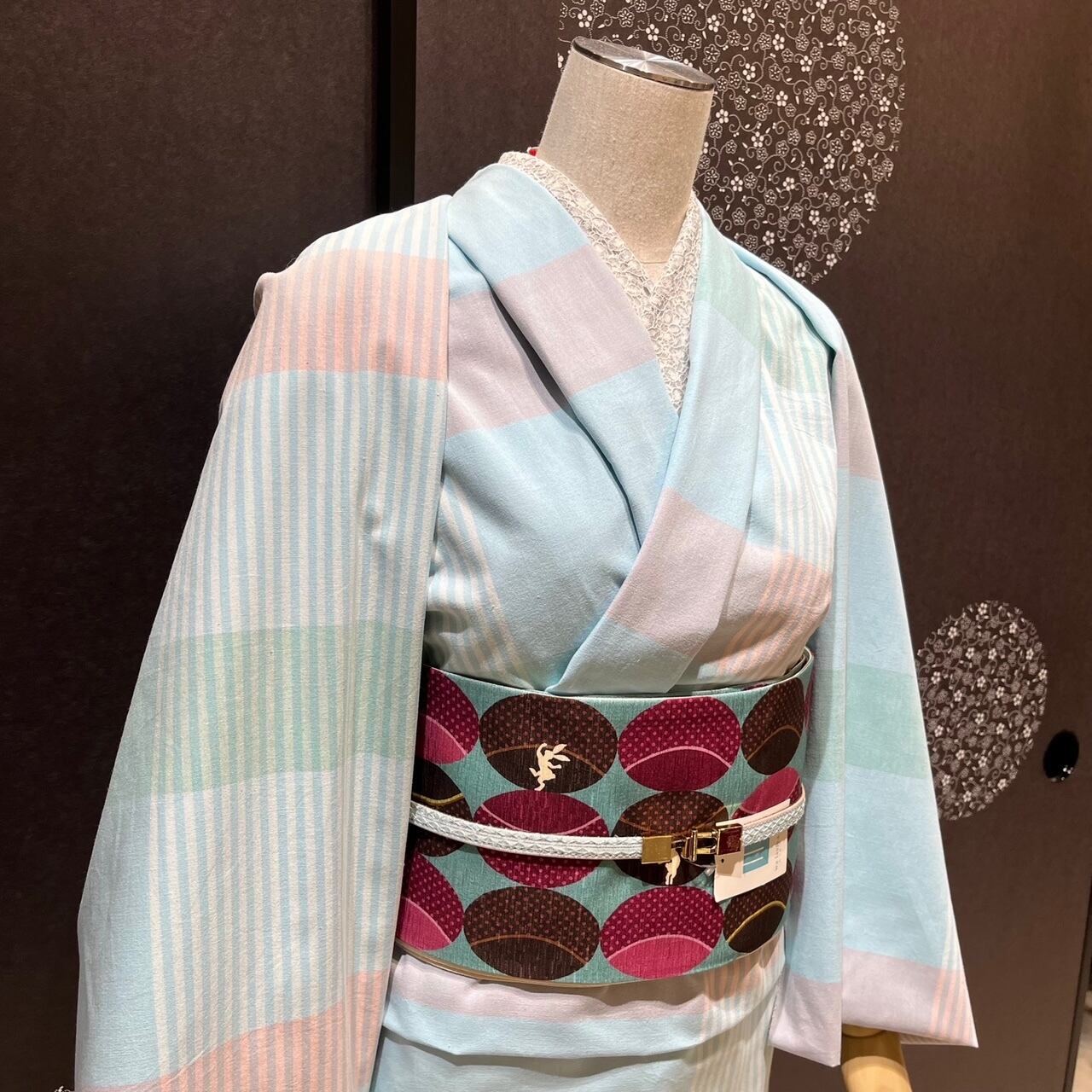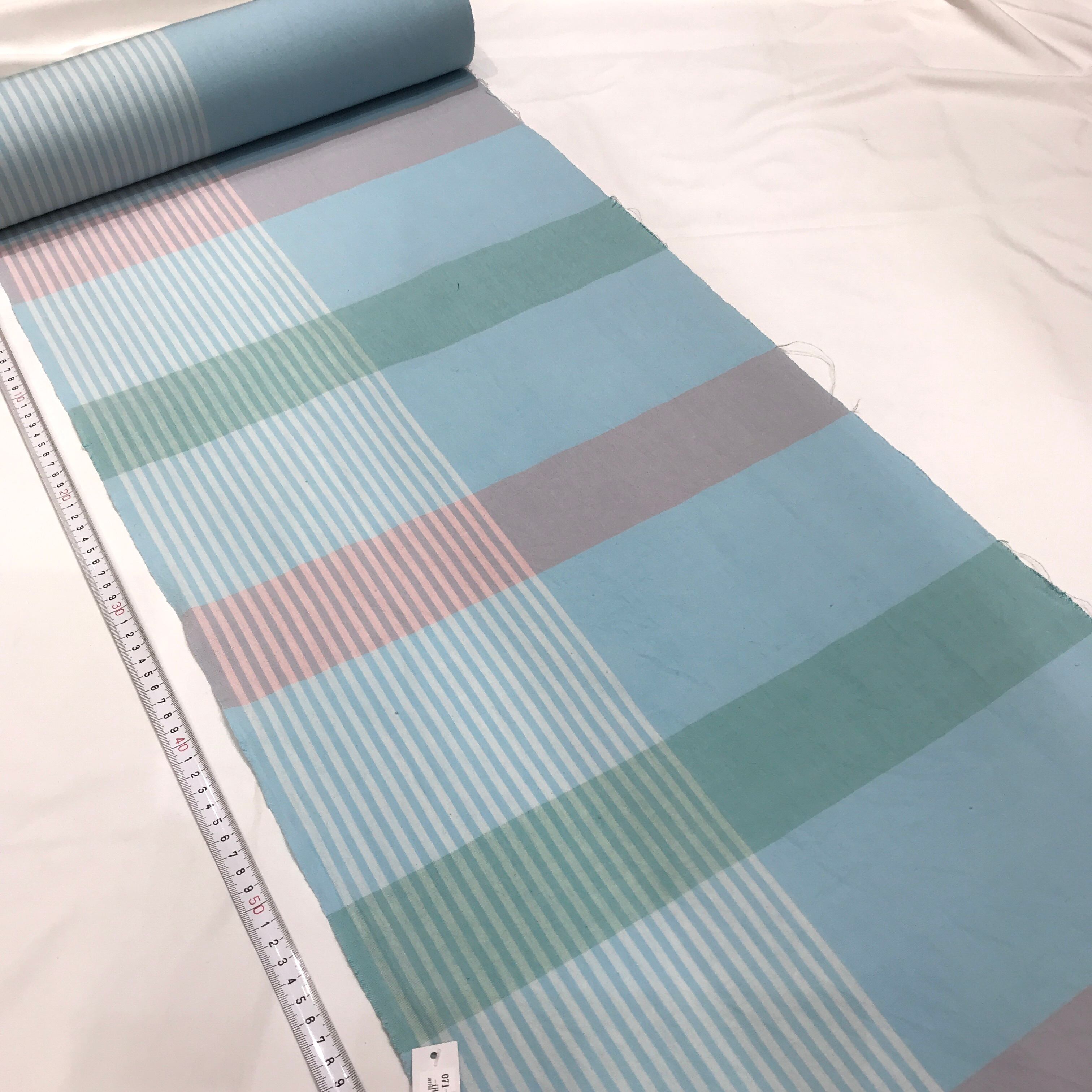 パステルカラーのブロックチェックと縞が並んだ個性的だけど優しい雰囲気の反物です。